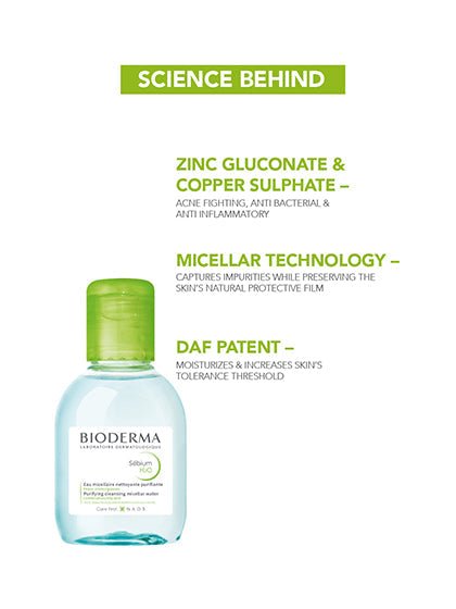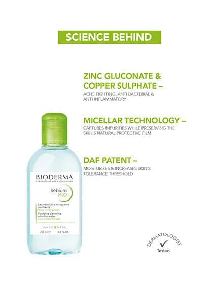 Sébium H2O is a specific make-up removing micellar water for combination to oily skin that mimics the natural composition of the skin for perfect make-up removal and total respect for even the most sensitive skin. Enriched with purifying agents, zinc gluconate and copper sulphate, Sébium H2O purifies the skin and limits sebaceous secretion. The patent natural complex raises the skin’s tolerance threshold.