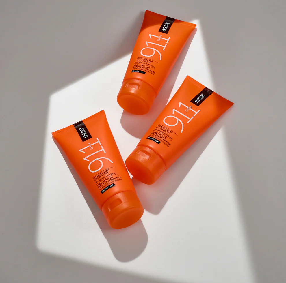 911 Quinoa Hydration Boost Styling Cream is a Leave-in hydrating styling cream, enriched with Superfood Quinoa Extract and super-hydrator Hyaluronic Acid. Helps to restore moisture, softness and shine without weighing the hair down. Formulated with a light hold, it helps to smooth the cuticle and reduce frizz while adding extra body to your blowout.