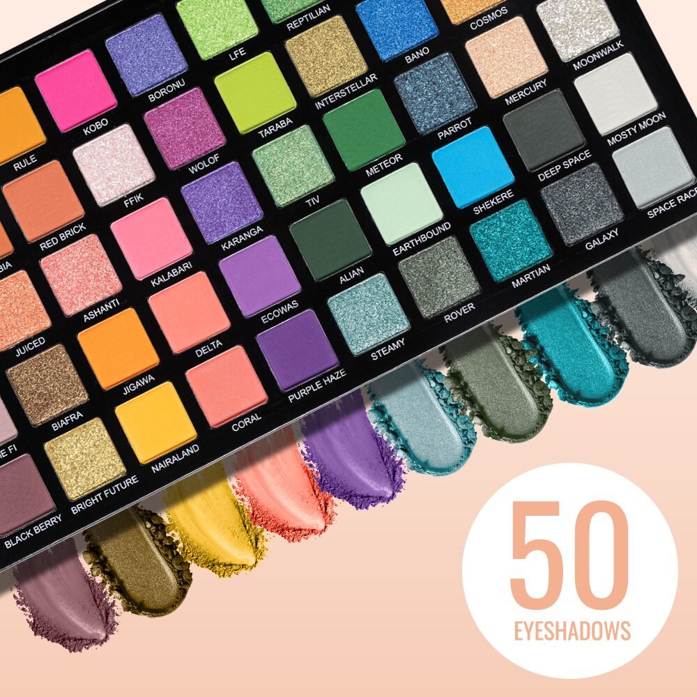 Introducing our dazzling eyeshadow palette – a treasure trove of 50 matte and shimmer shades, carefully curated to create your boldest and brightest looks. This beginner’s palette is a radiant interpretation of the ultimate color spectrum collection, showcasing a fusion of pinks, blues, greens, yellows, and purples.
