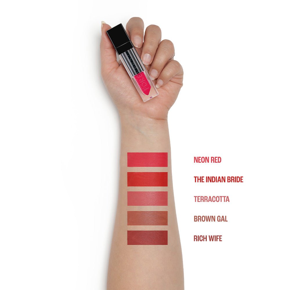 | Liquid Matte Lipstick | LML001 | Neon Red, LML002 | The Indian Bride, LML003 | Terracotta, LML004 | Brown Gal, LML005 | Rich Wife |