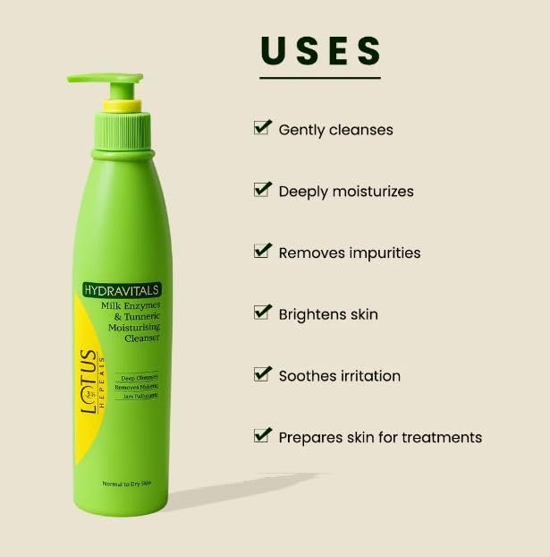 Gently cleanse and soften your skin by leaving a hydrating film by applying this Hydravitals Milk Enzymes and Turmeric Moisturizing Cleanser from Lotus Professional