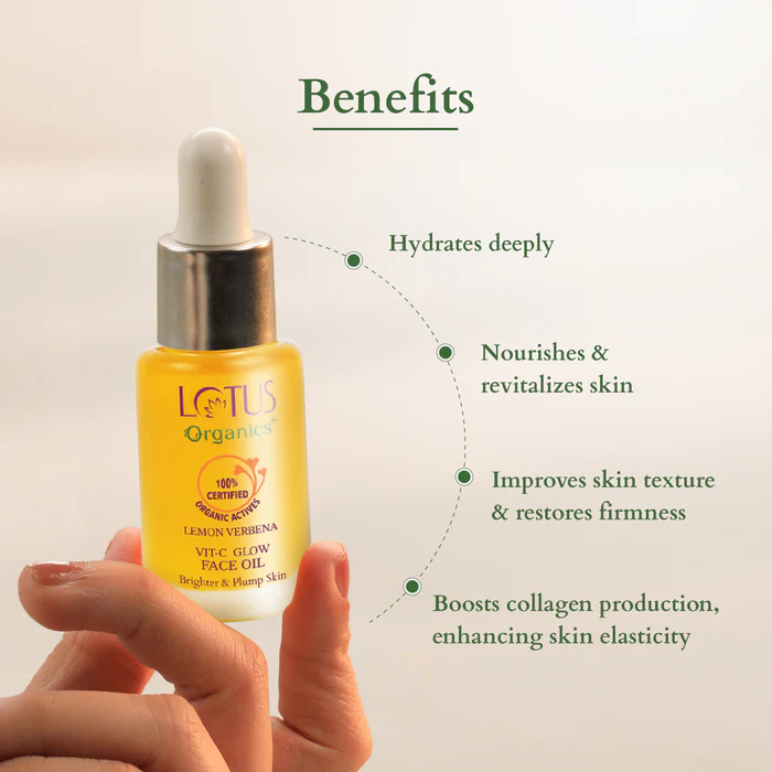 Lotus Organics+ Vit-C Glow Face Oil is a glow recipe carefully crafted with Cold pressed 100% Certified Organic Lemon Verbena, Carrot Oil, Sweet Almond Oil, and Olive Oil to pamper your skin & make it brighter and plumper. It will infuse your skin with new energy, youthfulness & radiance. The lightweight, soothing texture is non-greasy and melts gently to help visibly make the skin plum & radiant.