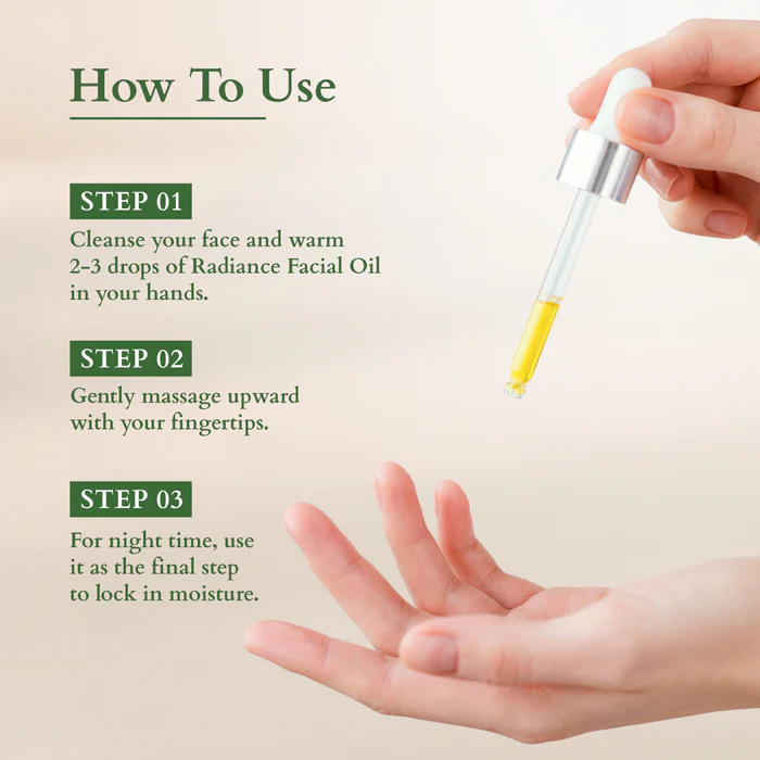 • Cleanse your face, and begin the ritual by massaging 2-3 drops of the Radiance Facial Oil between your hands.