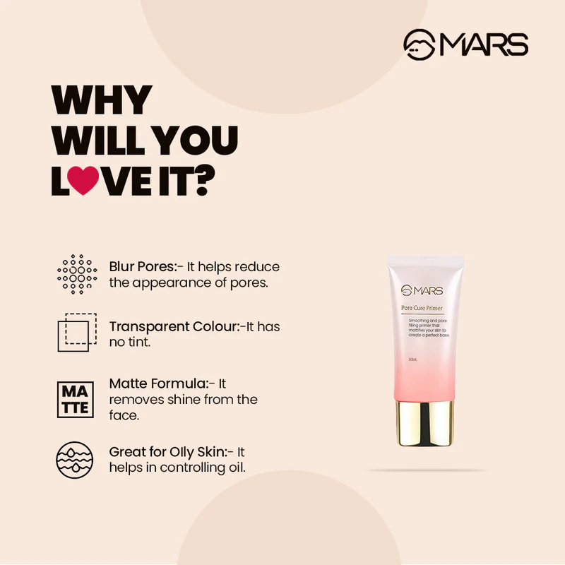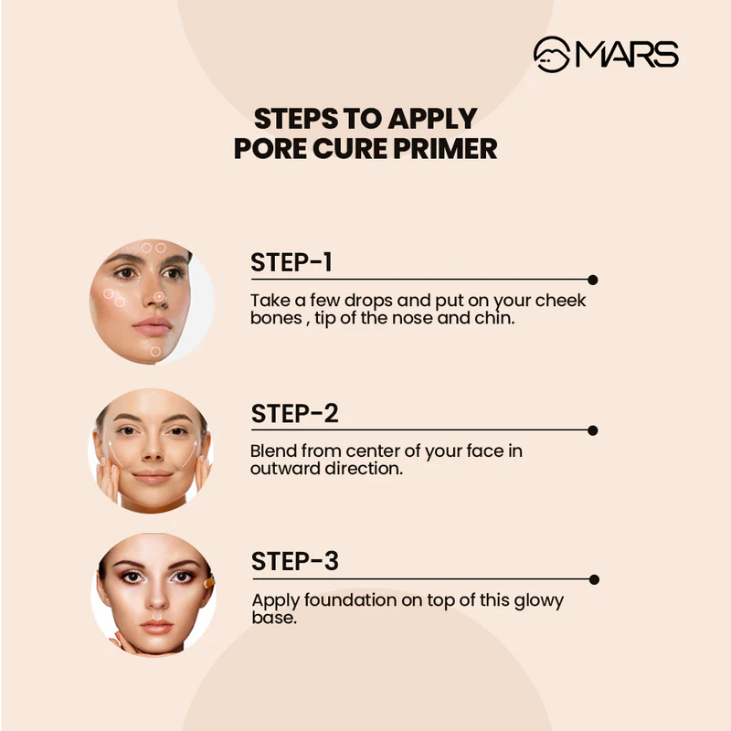 MARS Pore Cure Primer is a pore-filling primer that smooths and mattifies your skin to create the perfect base for foundation. It helps control oil throughout the day and works well on all skin types.