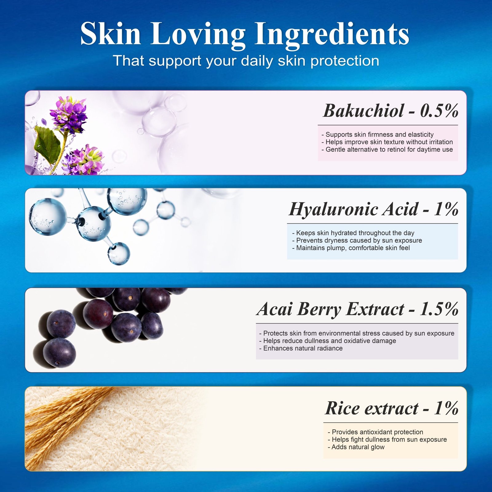 Powered by Acai Berry, Hyaluronic Acid, Bakuchiol, Niacinamide, and Rice Extract for radiance and firmness.