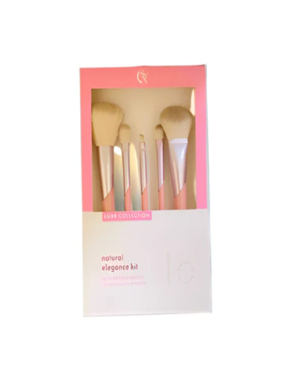 Luxe Limited Edition Natural Elegance Luxurious Face Brush Makeup Set includes (1) Angled Complexion Brush, (1) Softer Powder Brush, (1) Tapered Blending Brush, (1) Concealer and Foundation Brush, along with (1) Angled Liner Brush
