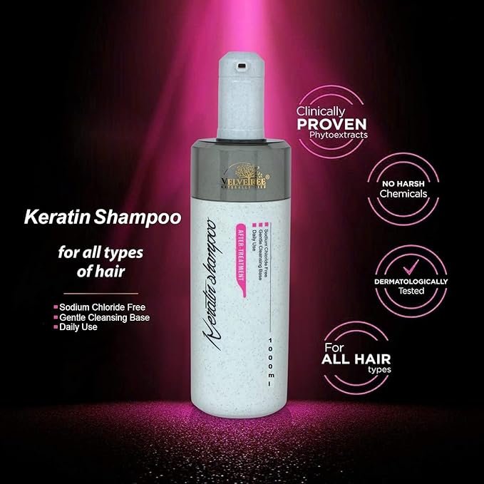 Velvetree’s keratin shampoo and after-treatment are a dynamic duo designed for daily use, providing nourishment and protection for your tresses. The keratin-infused formula penetrates deep into the hair shaft, replenishing the vital protein that gives your hair its strength and resilience. This potent blend not only restores damaged hair but also fortifies it against future harm from heat styling, environmental stressors, and chemical treatments. With regular use, you’ll notice a remarkable transformation – frizzy, unruly locks become sleek, manageable, and radiant with a mirror-like shine. The after-treatment seals in the benefits of the shampoo, ensuring long-lasting smoothness and manageability. Indulge in this luxurious hair care regimen and unlock the secret to luscious, healthy tresses that demand attention. For best results, use the shampoo and after-treatment in tandem, massaging gently into damp hair and rinsing thoroughly. Embrace the power of keratin and experience the Velvetree difference with every wash.
