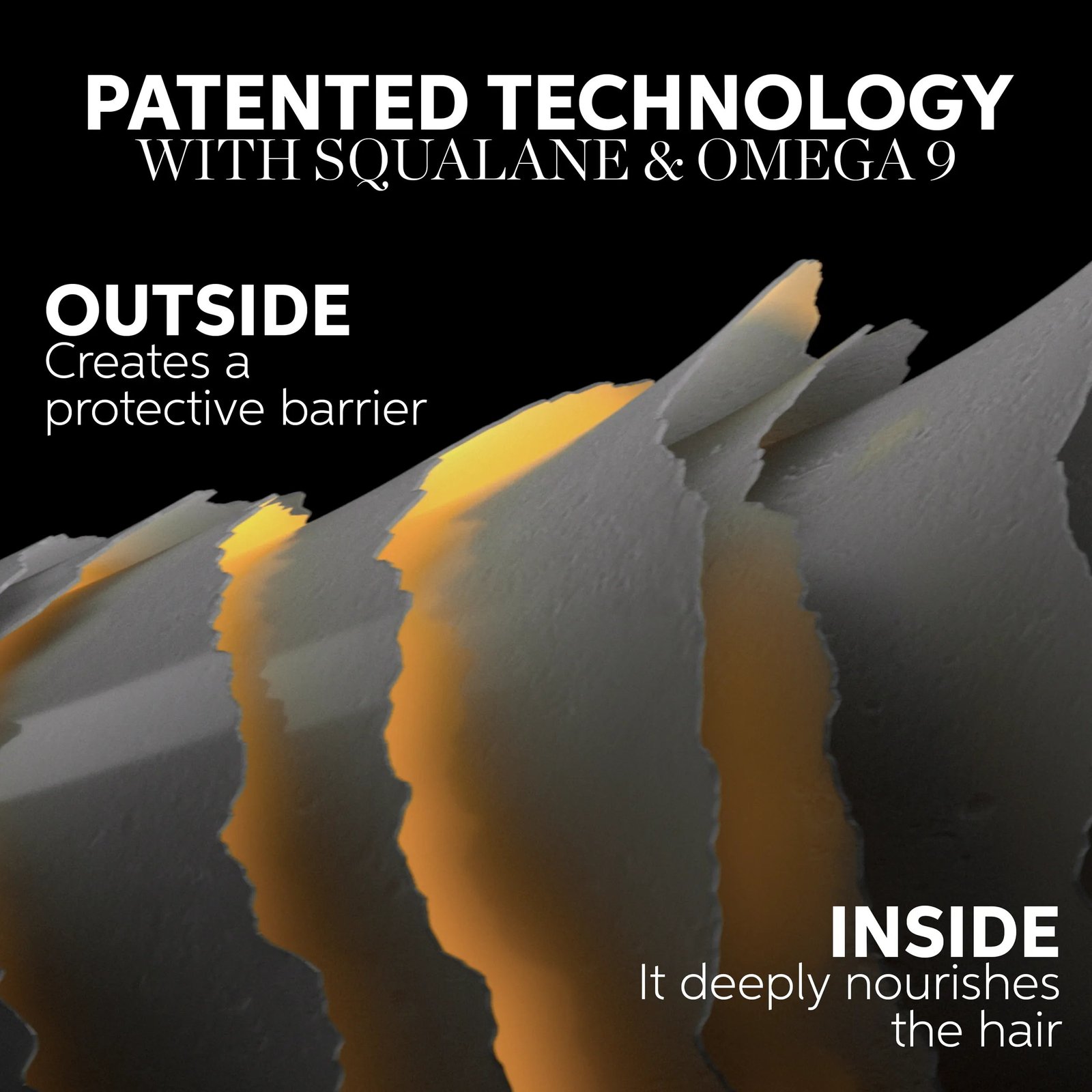 Patented technology with Squalane & Omega-9 to deeply nourish hair inside and recreate a protective barrier